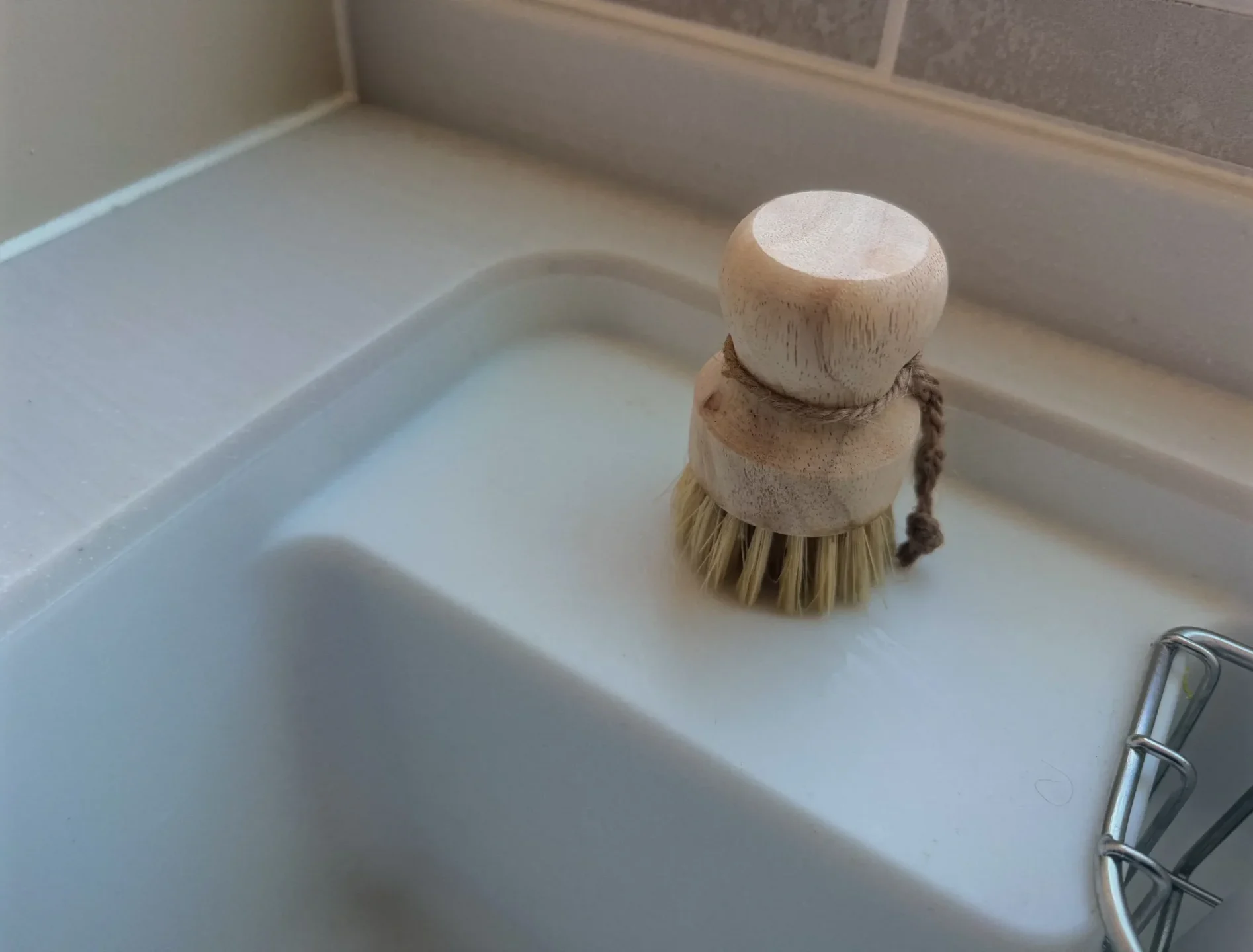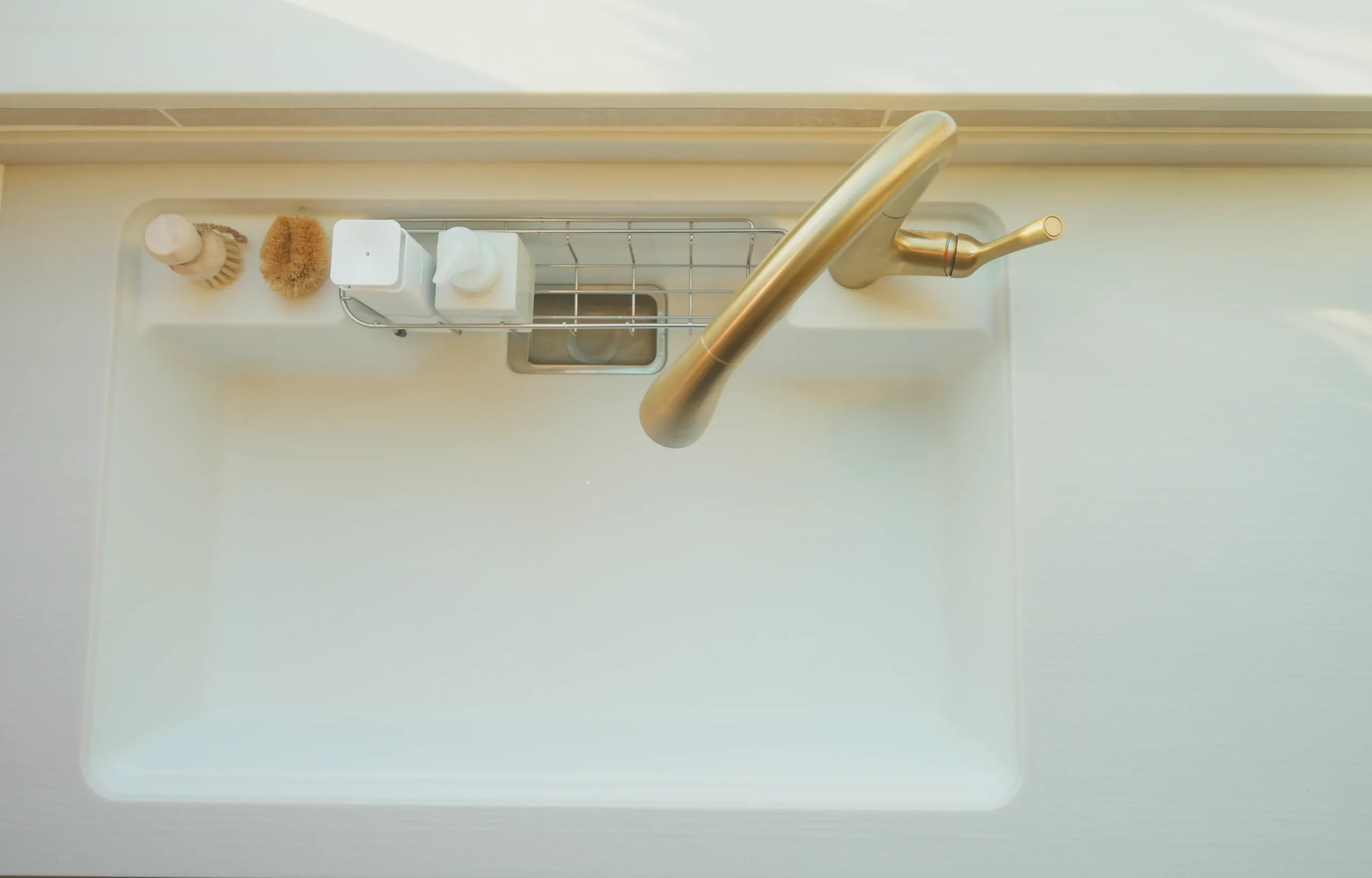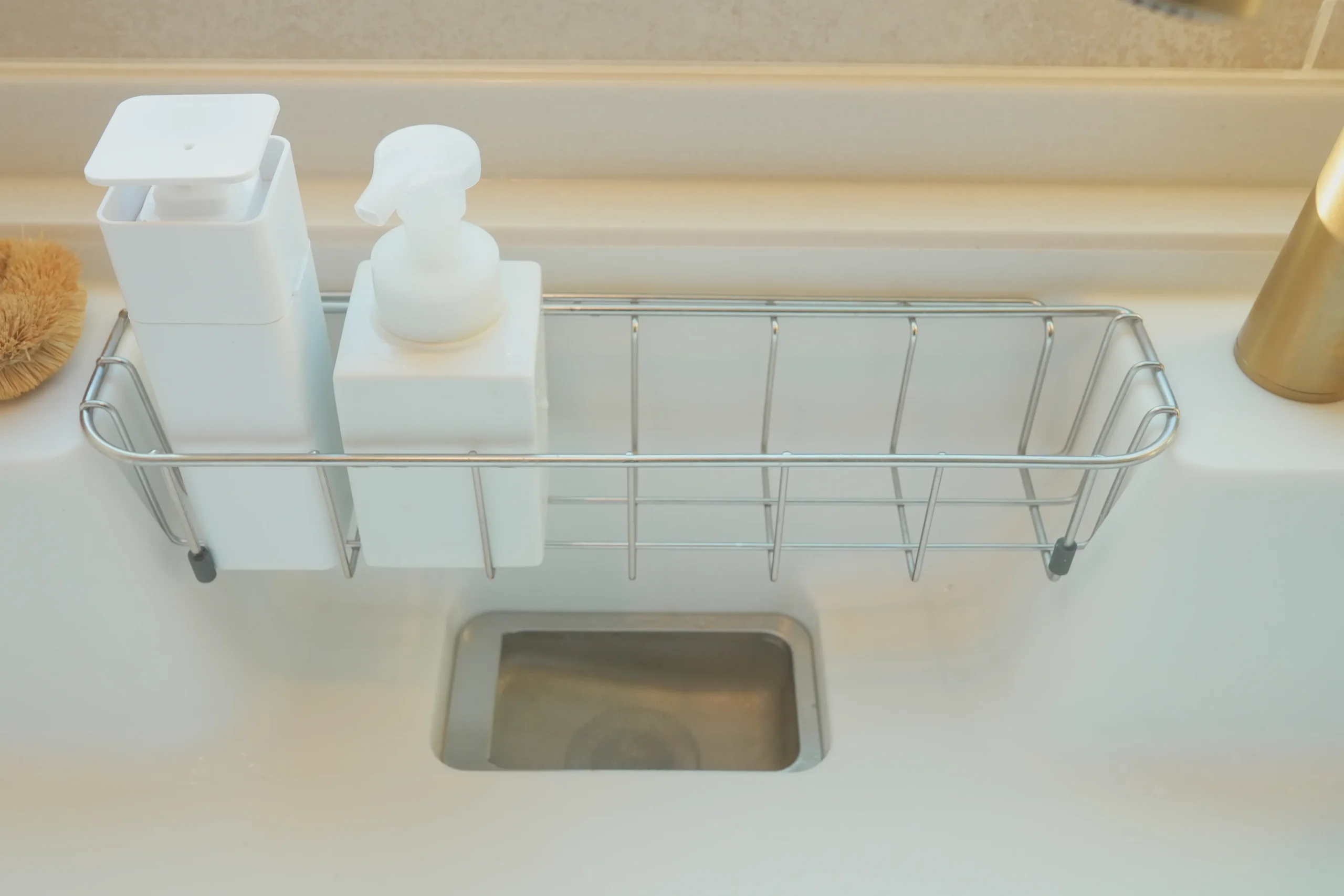 濡れたスポンジや洗剤のボトル、ハンドソープなどを定位置に浮かせて置けるため、シンク周りが常に清潔に保てています。
