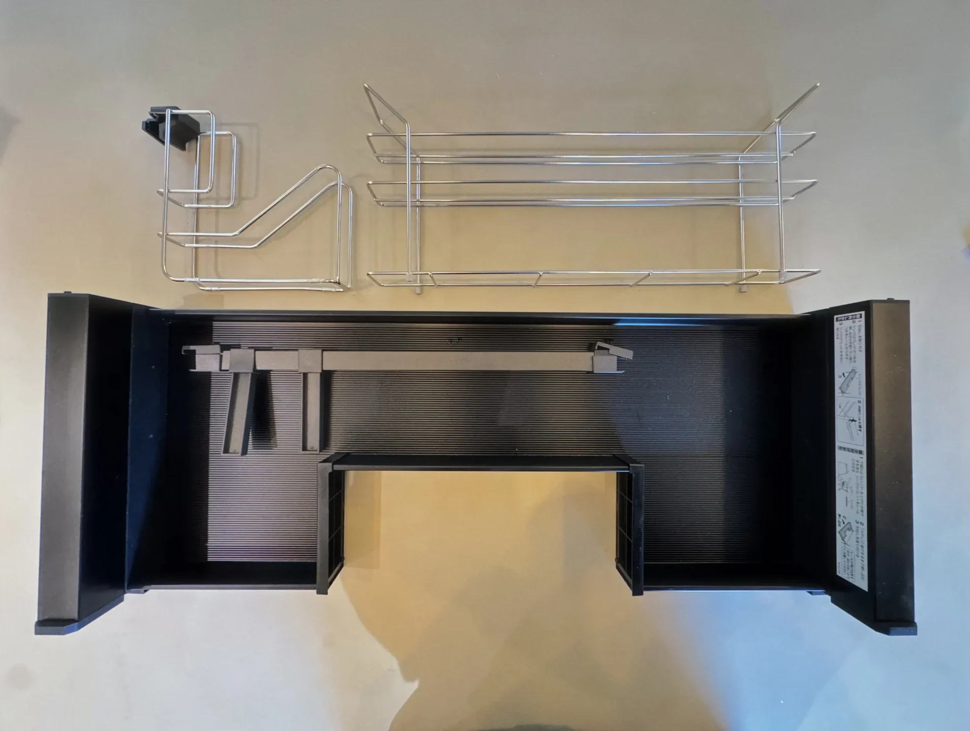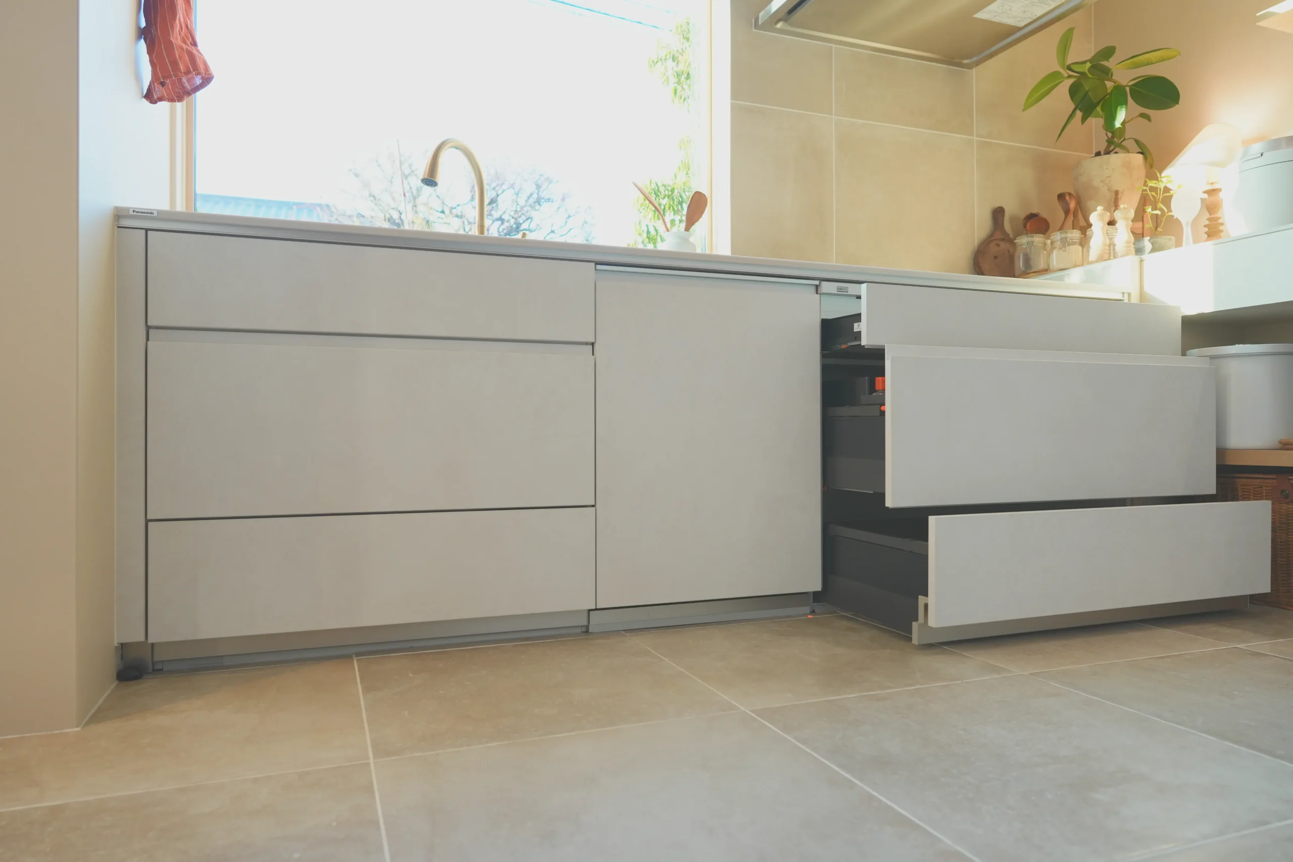 Panasonicのキッチンは、引き出し内部に黒い仕切りや鍋蓋ホルダーなどがいくつか付属しています。 これらを自由に組み替えられるのは便利なのですが……私たちの使い方には合わず、思い切って外してしまいました。