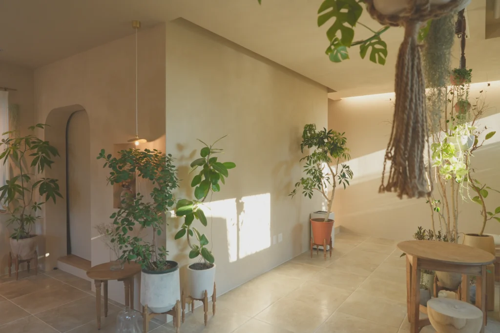 大開口の窓からたっぷりの光と風が差し込み、お気に入りの植物たちがのびのびと育つリビング。