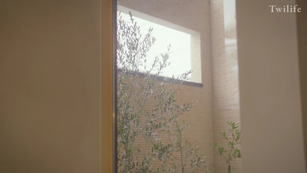 高さ2.7mの大きな掃き出し窓の奥には、南欧のヴィラをイメージした小さな中庭があります。