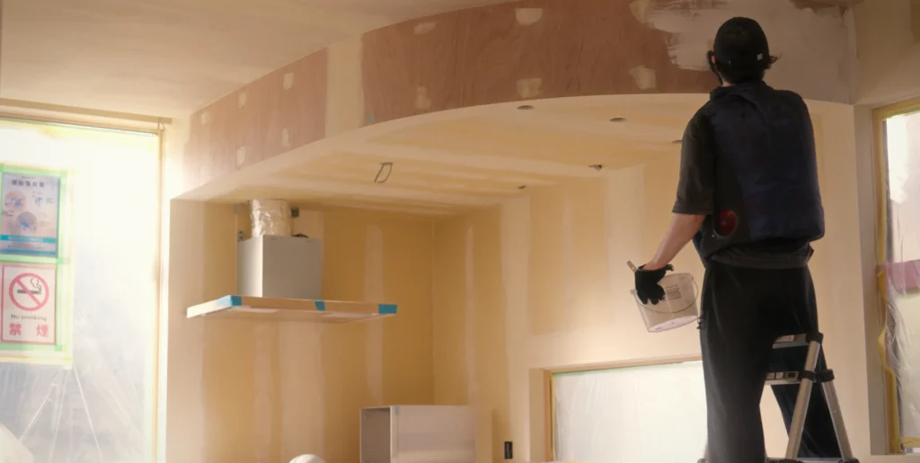 【採用箇所】キッチンの壁、ワークスペースの壁・天井