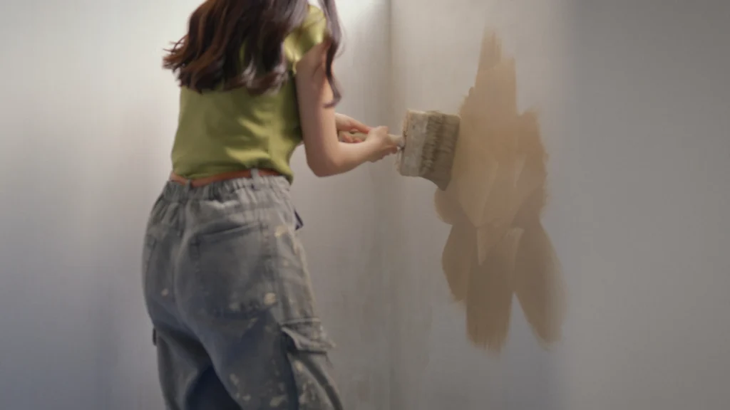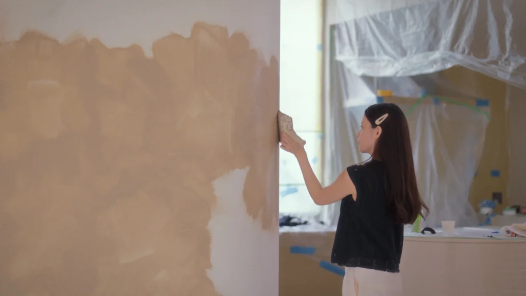 刷毛の毛先に少しだけ塗料をつけ、壁に雲を描くようにいくつかブロックをつくり、それをつなぎ合わせるようにしていくと独特の美しいムラ感が生まれます。
