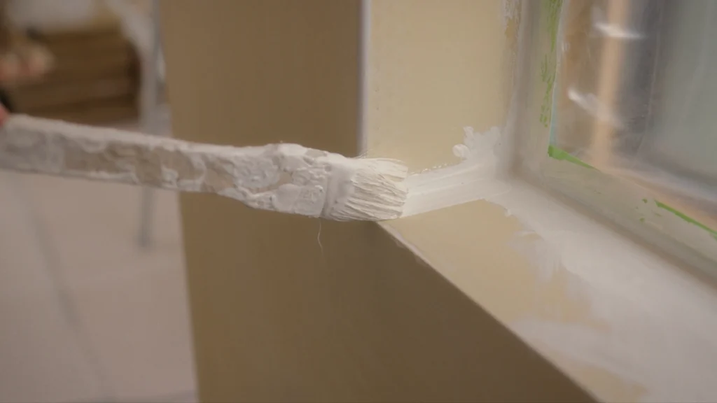 下地のシーラーは、もったりとした質感で伸びにくく、かつ薄く塗り広げる必要があるため、刷毛に少しだけ付けて壁に擦り付けるように塗っていきます。