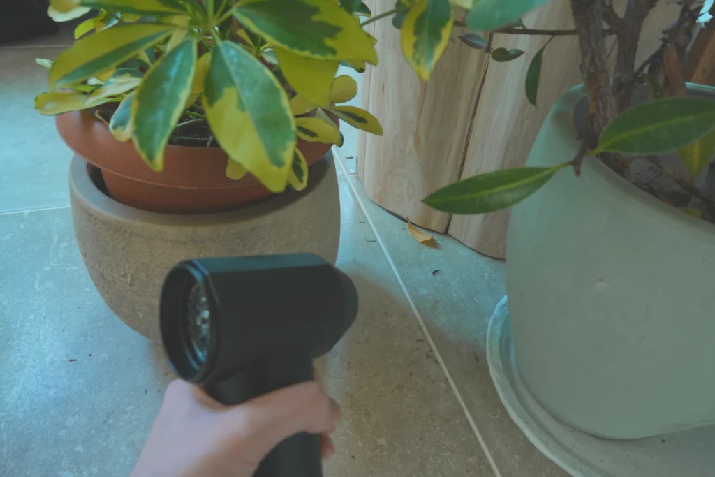机の上や棚、ロボット掃除機では届かない観葉植物の鉢の間などのゴミを、エアダスターの風でサッと床に吹き飛ばし、あとはロボット掃除機に丸投げして吸ってもらっています。