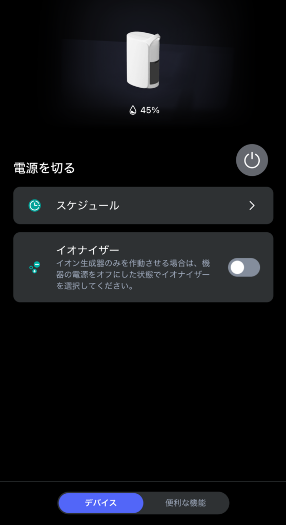 リビングでくつろいでいる時でも、スマホから電源のオンオフやモードの変更ができます。「あ、除湿機つけ忘れた!」という時も、逆にわざわざ2階のランドリールームまで行く必要がありません。