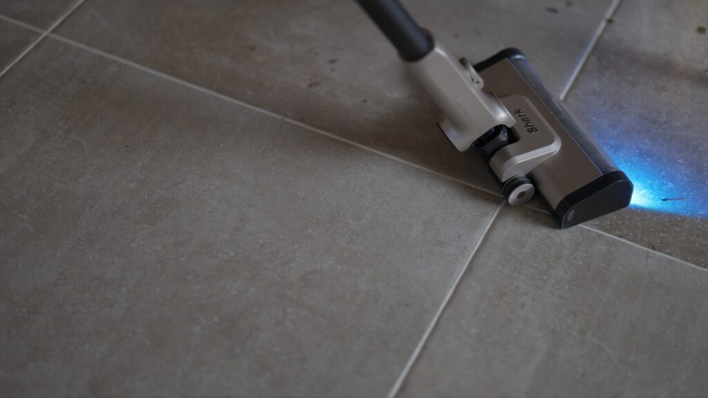 ですが、この掃除機のヘッドには青色のLEDライトが付いていて、床を照らすと目では気付きにくい細かなホコリがくっきりと浮かび上がります。